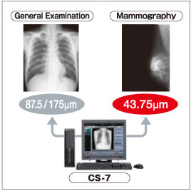Además de la capacidad de lectura anterior de 175 y 87.5 μm, se agregó una nueva función de lectura de 43.75μm para mamografía. En mamografía, las imágenes de gran valor ahora están disponibles con mayor resolución. Además, las imágenes de resolución ultra alta se han logrado empleando C-PLATE para mamografías con excelente nitidez y granularidad. El casete para mamografías se puede manejar de la misma manera que en el casete estándar anterior, proporcionando la misma operatividad.